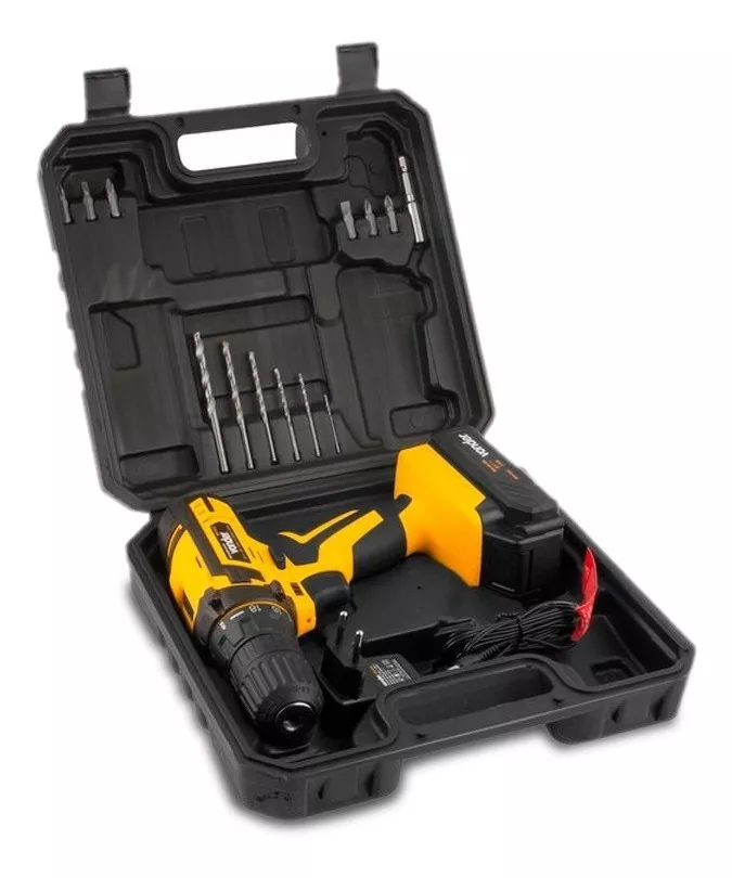 1 destornillador/taladro viene con: 1 estuche de transporte, 1 batería de 12 V, 1 cargador bivolt automático, 6 brocas para madera (1,5 mm, 2,5 mm, 3,0 mm, 4,0 mm, 5,0 mm y 6,0 mm), 6 brocas (2 ranuras) (5 mm y 6 mm), 2 phillips (PH1 y PH2) y 2 pozidrives (PZ1 y PZ2)) y 1 conector magnético de 1/4?